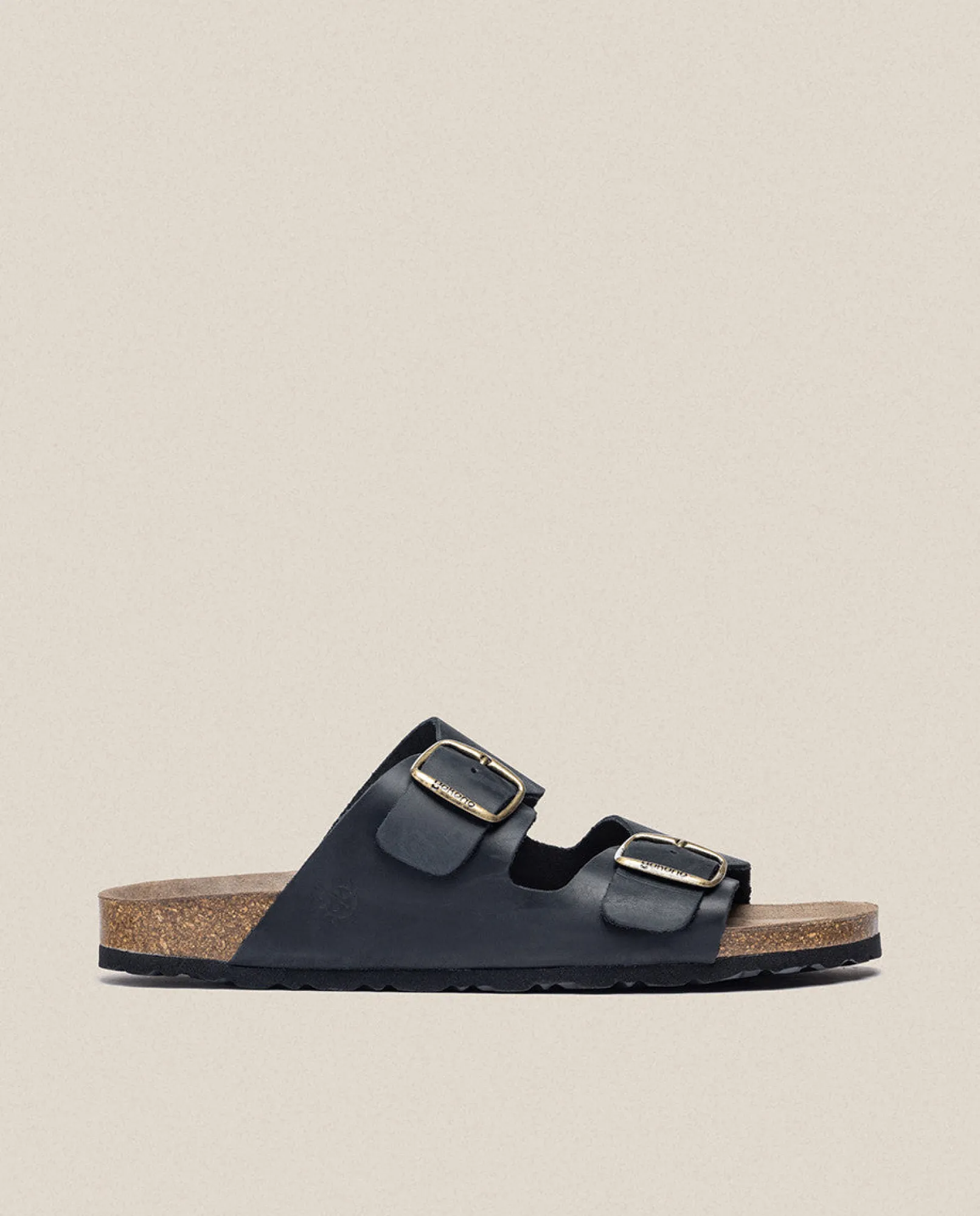 La classique sandale plate MACAM 150 en sprinter noir, composé de deux brides couvrant le cou-de-pied et de deux grandes boucles remarquables. Semelle de 2 cm. Semelle intérieure matelassée et antidérapante qui garantit une adhérence et un confort absolus du pied. Fabrication artisanale en Espagne, matériau en cuir et utilisation de teintures végétales respectueuses de l’environnement.