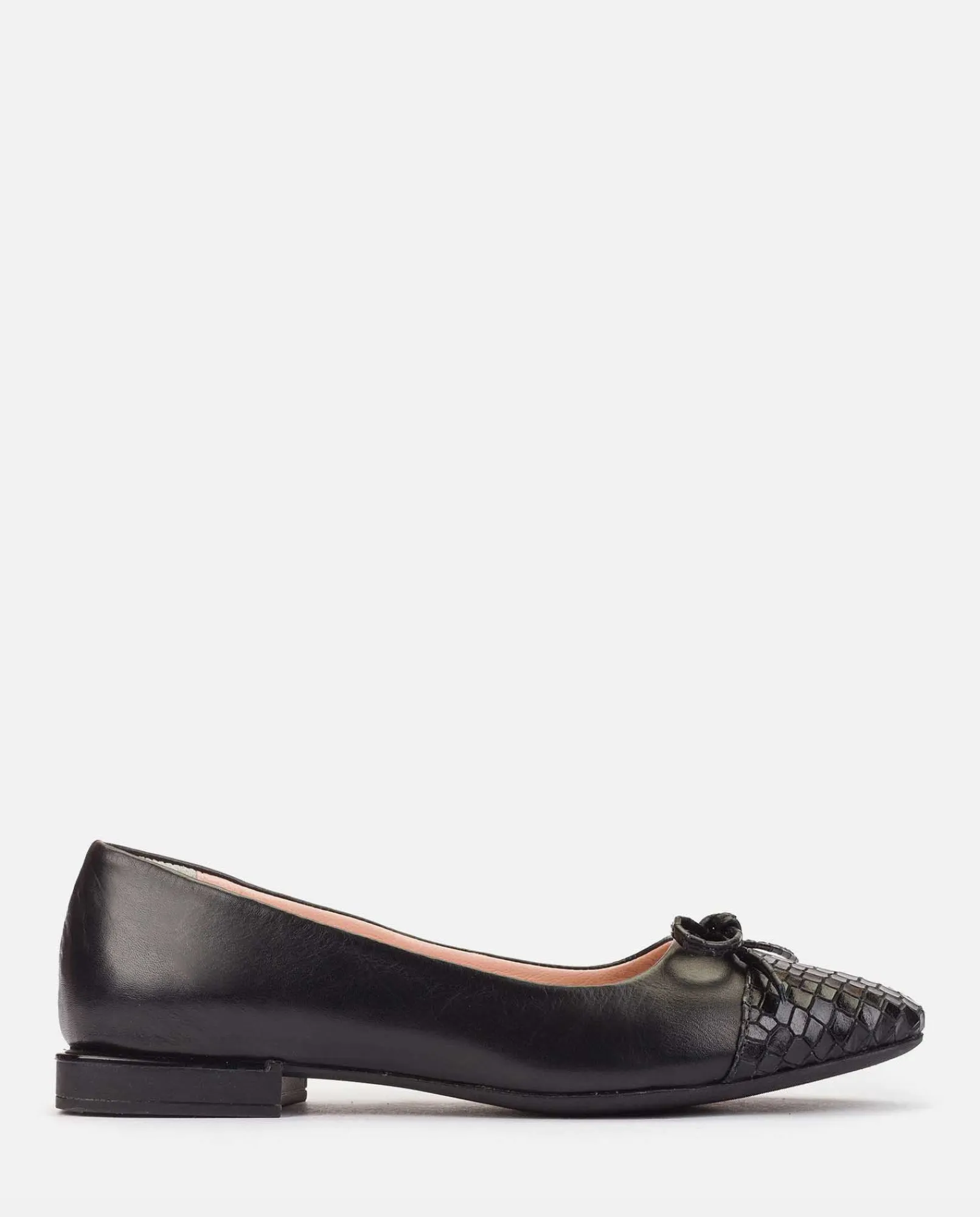 Ballerine en noir d’une hauteur de 1,5 cm. Il est doté d’un embout avec des détails en noix de coco et d’un nœud sur …