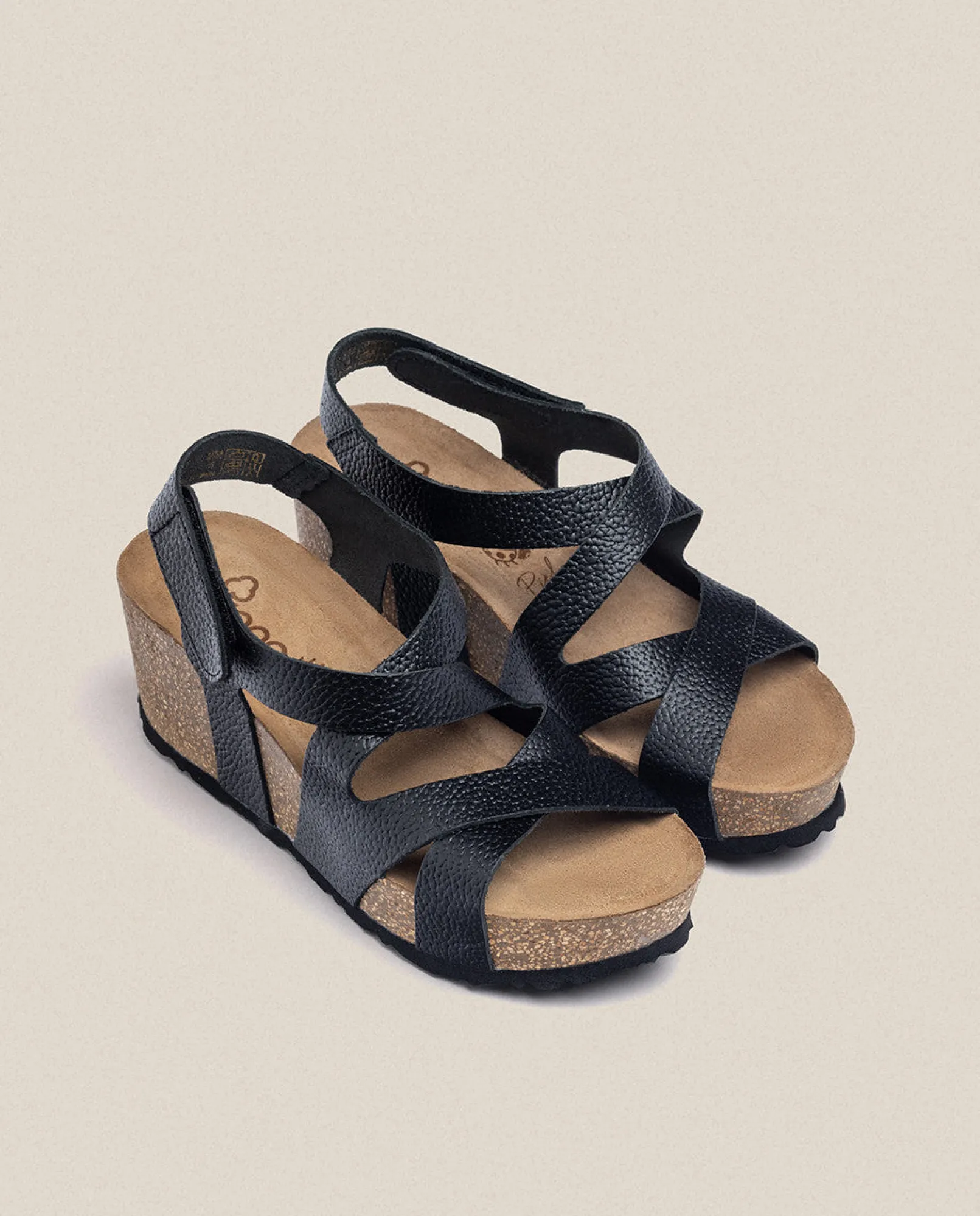 La sandale à semelle compensée BARI 303 en noir, composée de lanières entrelacées qui représentent la simplicité et le style en un seul design. Il possède une semelle de 5,5 cm et une semelle intérieure matelassée et antidérapante qui garantit l’adhérence du pied. Il est fabriqué à la main en Espagne à l’aide de teintures végétales respectueuses de l’environnement.