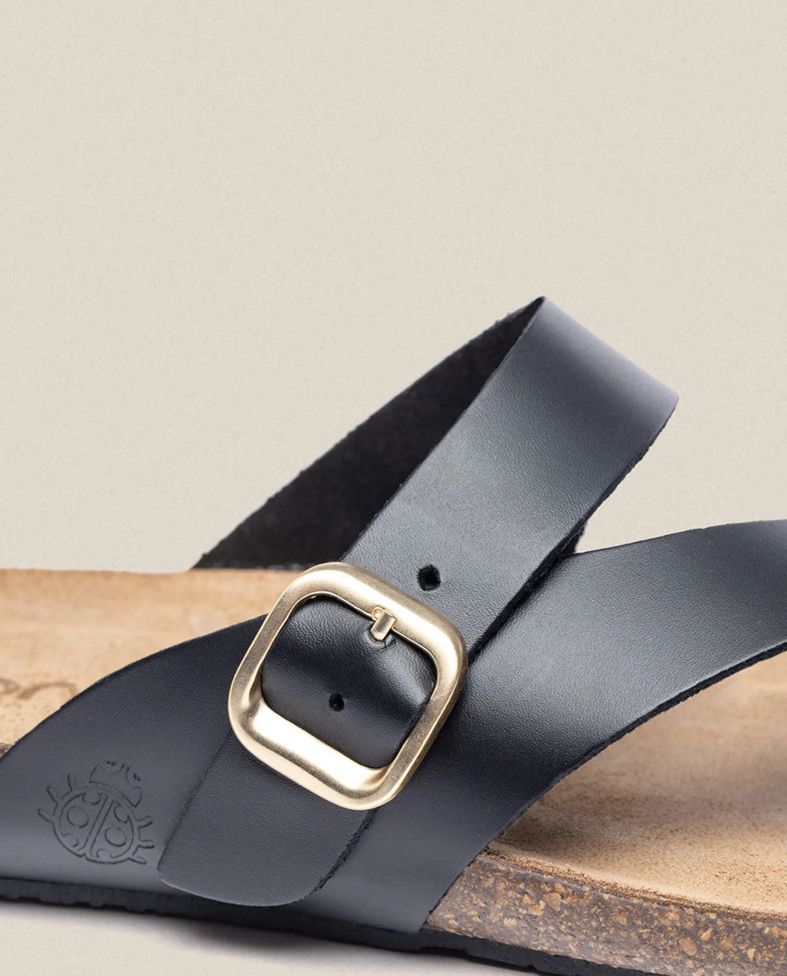 Sandale noire plate d’une hauteur de 2 centimètres. Elle est dotée de deux brides en cuir de vachette. L’une va des orteils au cou-de-pied et l’autre traverse le pied horizontalement et s’y ajuste parfaitement grâce à une boucle métallique. Il est doté d’une semelle intérieure rembourrée. Il s’agit sans aucun doute d’une sandale confortable que vous pourrez porter lors de toutes sortes d’événements estivaux. Fabriquée en Espagne.
