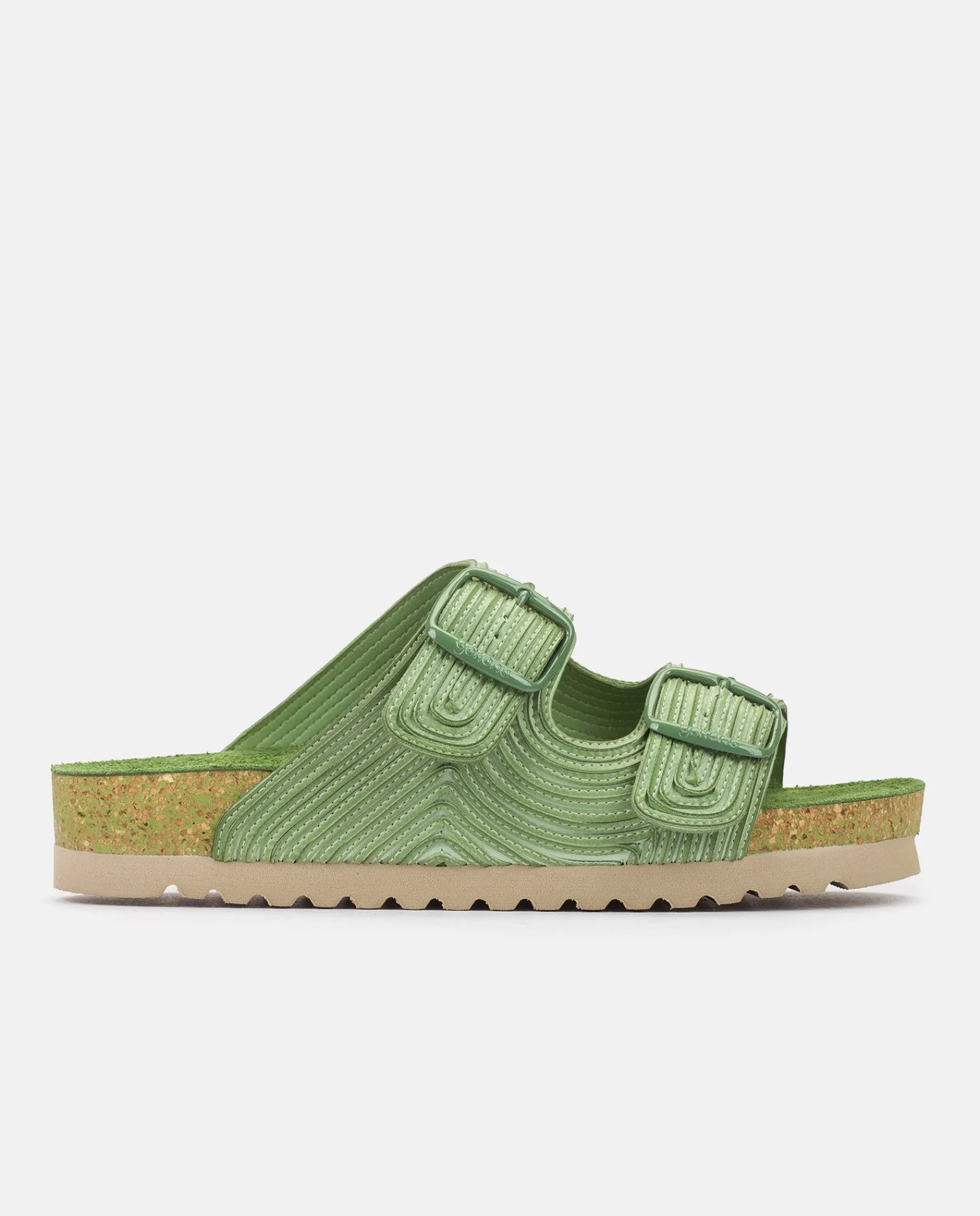 La sandale innovante NOJA 002 verte, avec une boucle sur chacune des lanières qui composent son design frappantet une t…